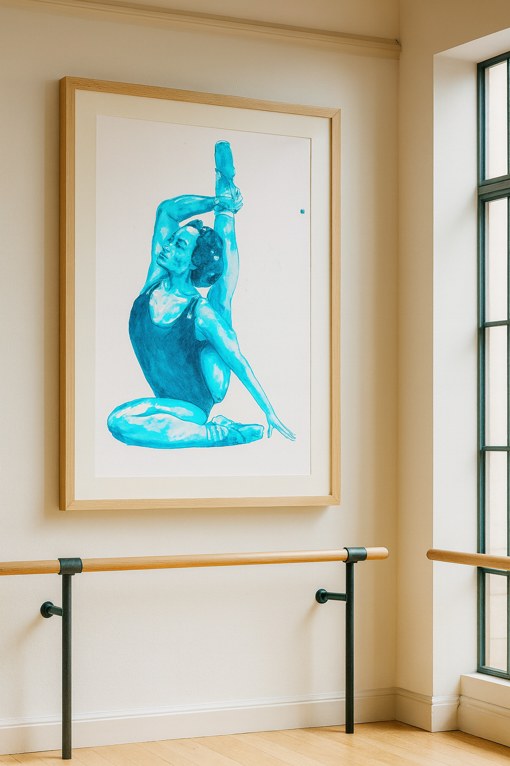 This striking blue-toned work captures the elegance and strength of a ballerina mid-pose, her body stretched into graceful lines that reflect both discipline and freedom. The monochromatic palette emphasizes form over detail, allowing light and shadow to sculpt her figure with intensity. A celebration of movement, resilience, and artistry, this piece transforms the precision of ballet into a powerful visual statement.