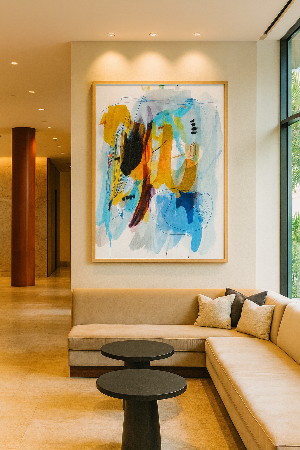 Golden Echoes radiates warmth and rhythm, with bold strokes of ochre, black, and cobalt layered against soft washes of blue and gray. The loops and marks feel both playful and intentional—like echoes of conversation drifting through a lively space. Positioned in a hotel lobby, this piece sets a tone of vibrancy and movement, welcoming guests into an atmosphere of energy and sophistication.
