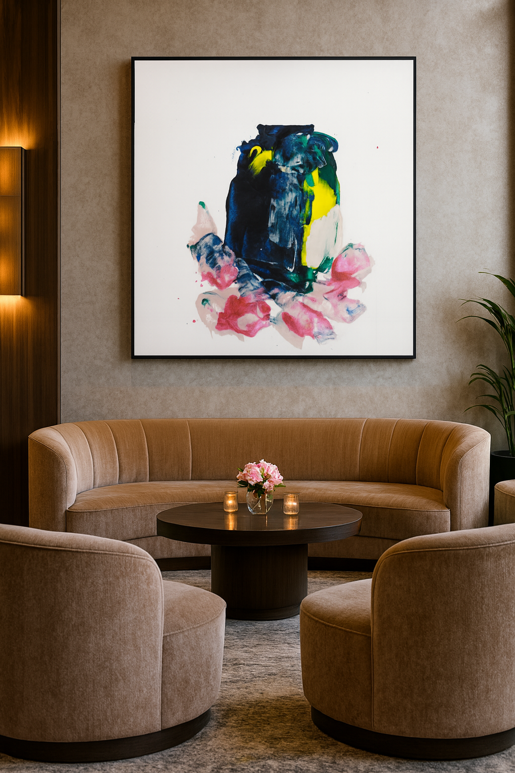 Description: Frozen Bloom is a striking abstract that contrasts bold, deep tones of midnight blue and emerald green with bursts of vibrant pink and soft white. The composition evokes the imagery of icy petals surrounding a hidden core, balancing strength with fragility. Its layered textures and dynamic brushstrokes create a sense of motion and transformation, making it a captivating centerpiece for any modern space.