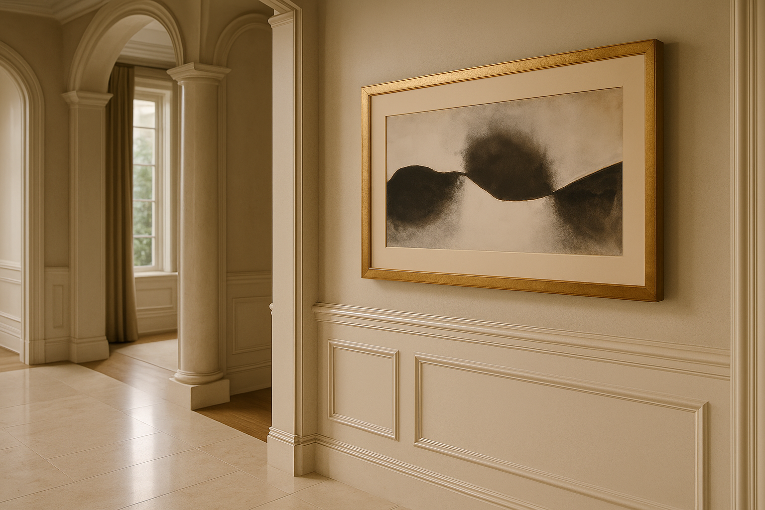 Between Stillness and Shadow is a meditation on balance — where darkness and light coexist in quiet tension. The composition’s soft gradients and gestural abstraction evoke a landscape suspended between form and void, silence and movement.