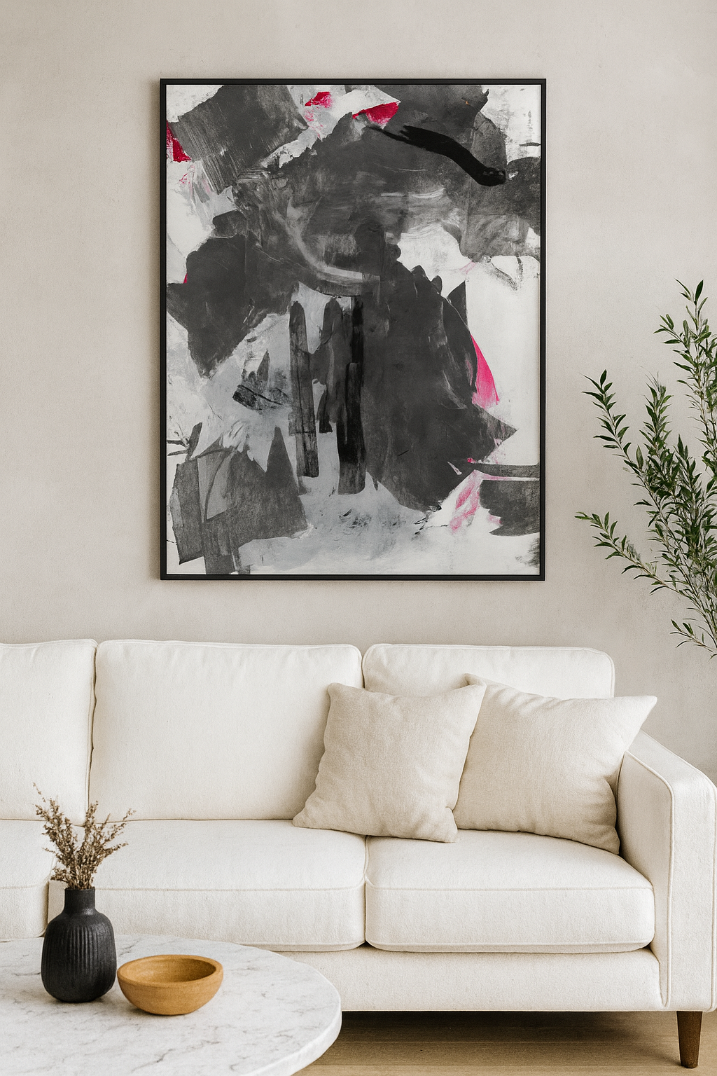 Bold sweeps of black and gray collide with flashes of white and red, creating a raw and dynamic composition. The piece evokes strength in contrast, balancing heaviness with fleeting sparks of energy, like echoes breaking through silence.