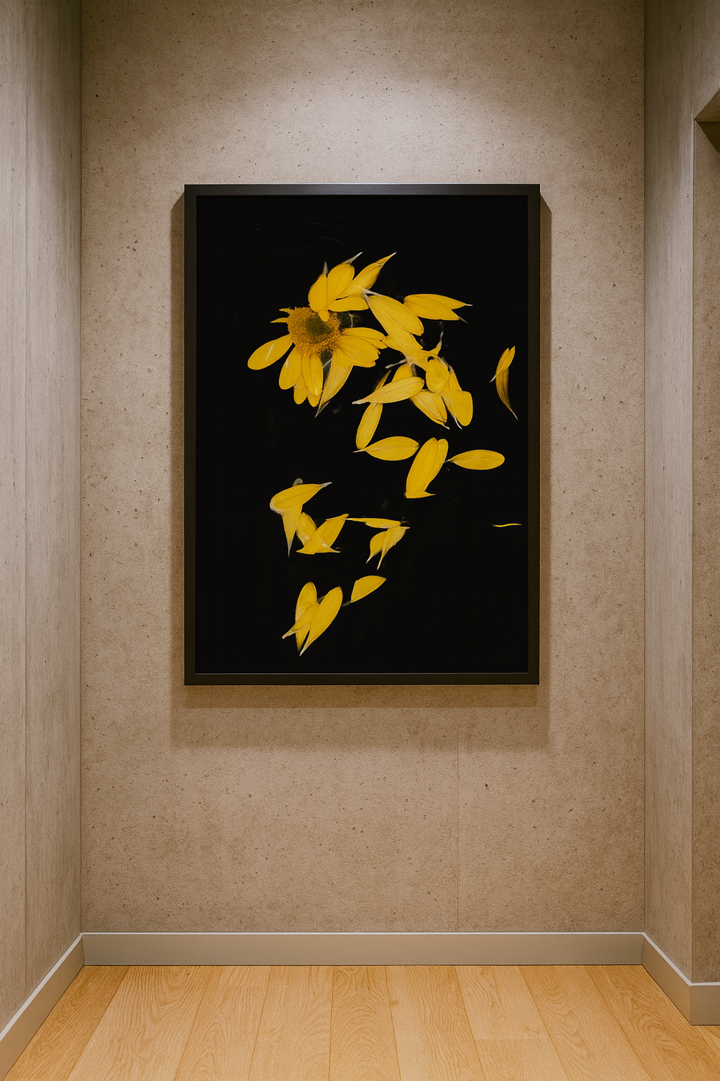 Falling Radiance captures the quiet unraveling of a sunflower as its bright yellow petals drift away into the darkness. Suspended mid-fall, each petal becomes its own moment—delicate, weightless, and full of motion. The deep black background amplifies the vibrancy of the yellows, creating a striking contrast that feels both emotional and poetic. This piece reflects the beauty found in letting go, transforming a fleeting moment into something timeless and luminous.