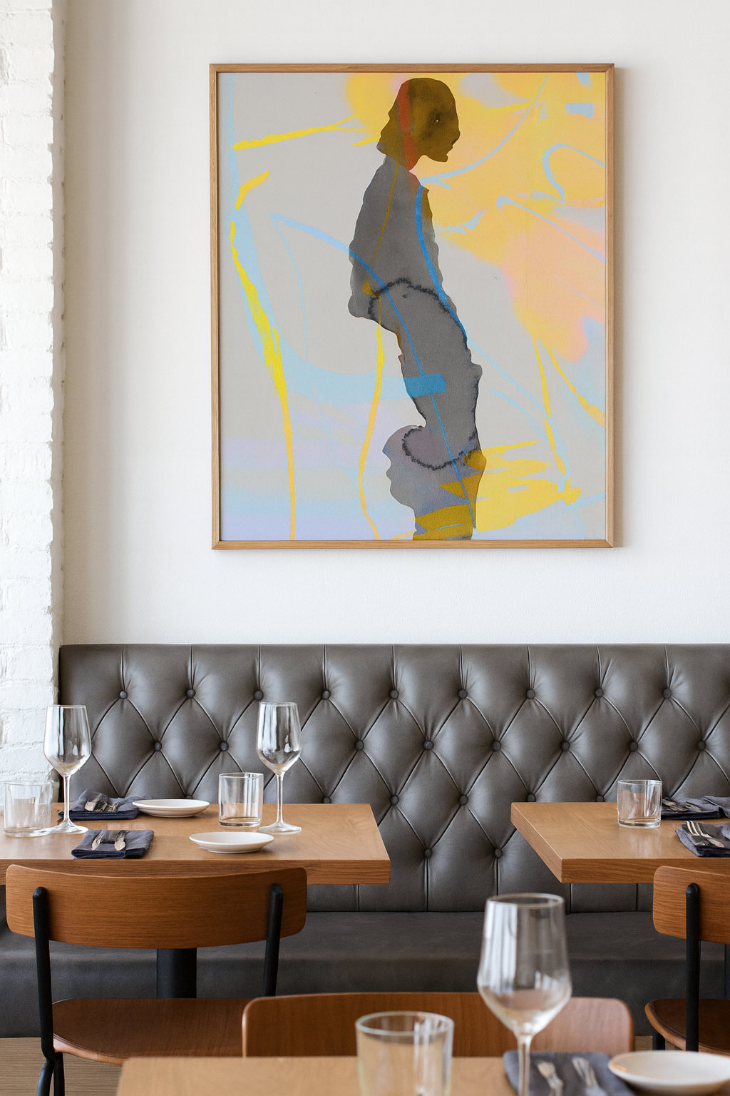 Silhouette in Light captures the contrast between shadow and radiance, with a dark, fluid figure outlined against a vibrant field of yellows, blues, and pastels. The piece balances mystery with energy—suggesting both solitude and movement within luminous surroundings. A striking work that adds depth and conversation to any modern restaurant or gathering space.