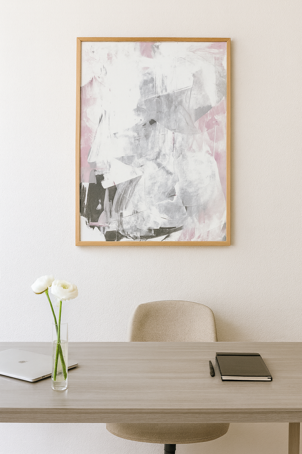 Soft layers of white, gray, and blush pink wash across the canvas, creating a dreamlike balance between concealment and revelation. Veil of Quiet is an abstract meditation on stillness, where textures shift like whispers and light passes through muted tones. A serene yet compelling piece, it brings sophistication and calm to any modern office or contemplative space.