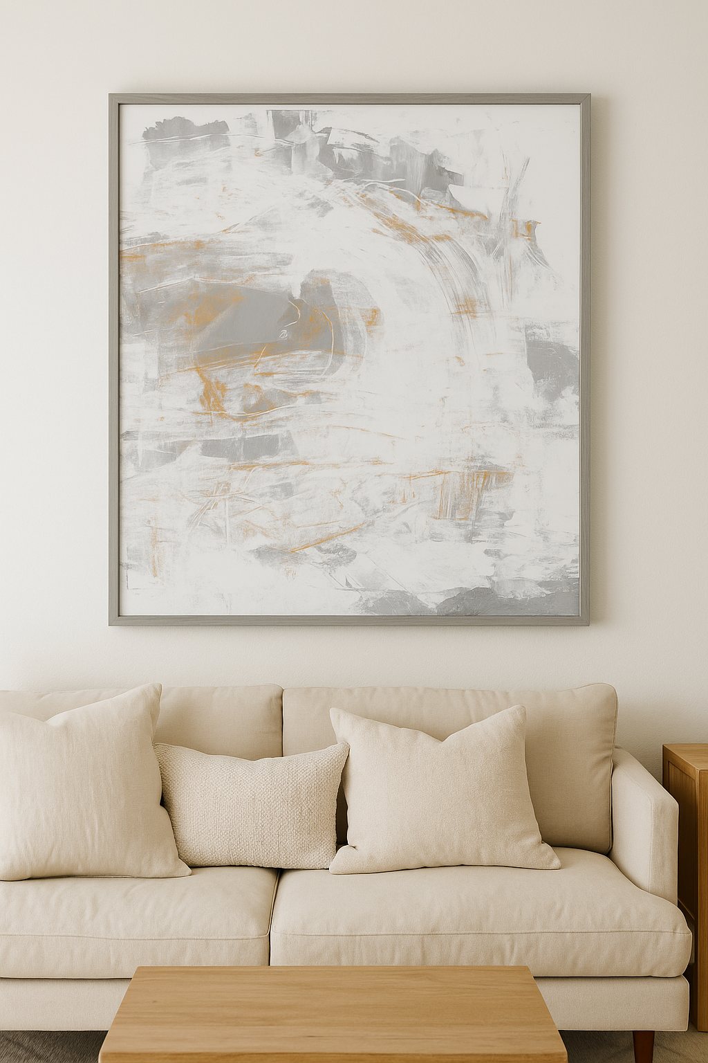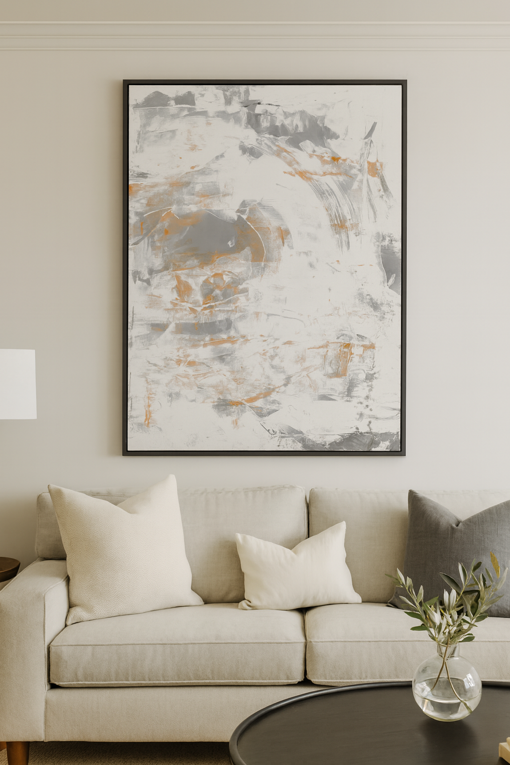 Veil of Silence layers soft whites and muted greys with subtle strokes of warm copper, creating a textured abstraction that feels both raw and ethereal. The sweeping movements suggest a veil being drawn across a surface, partially concealing and partially revealing what lies beneath. It evokes themes of quiet strength, hidden depth, and the delicate balance between chaos and calm. Perfect for modern interiors, this piece radiates understated elegance while inviting introspection.