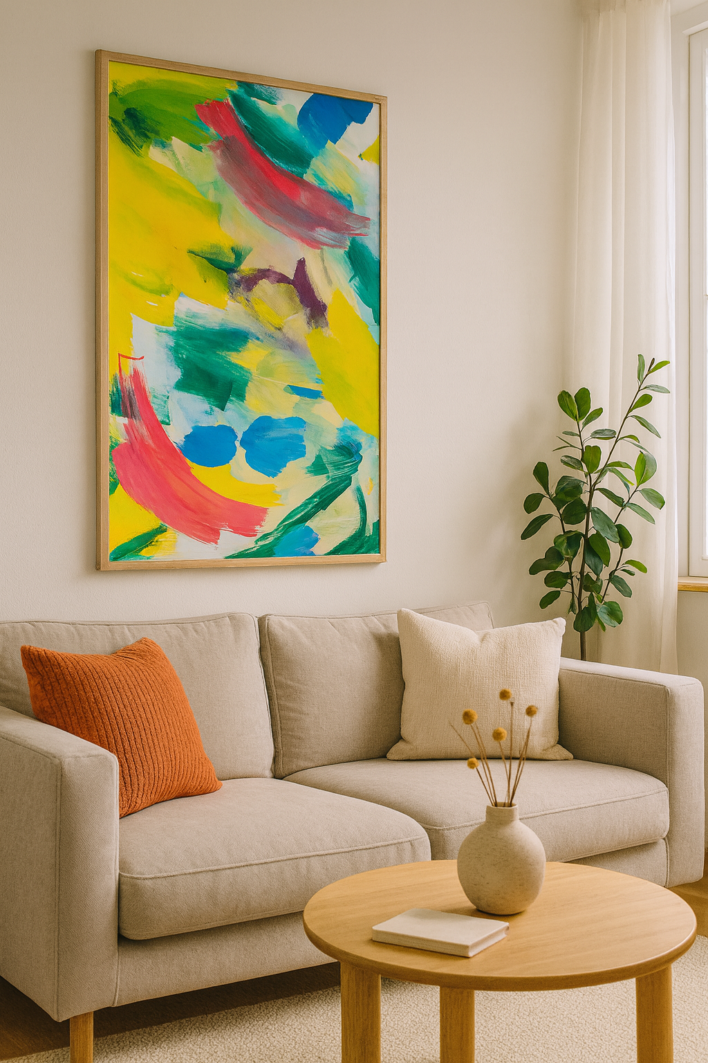 Joyful Motion bursts with life, its sweeping strokes of yellow, green, and crimson moving like sunlight through a playful dance. Layers of blue and purple ground the composition, while the vivid palette celebrates spontaneity and energy. A piece that radiates warmth and optimism, designed to brighten and invigorate any space.