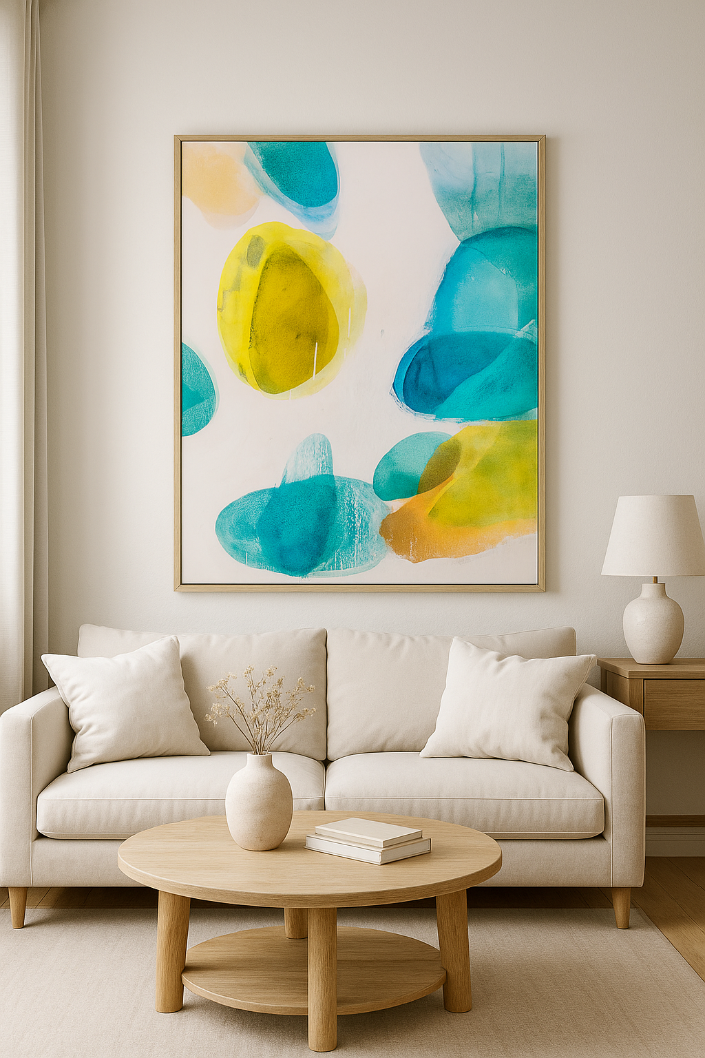 Celestial Stones captures the essence of light filtering through water, with translucent forms in teal, aqua, golden yellow, and soft amber. The layered shapes resemble polished river stones or fragments of stained glass, each glowing with quiet radiance. The composition invites a meditative pause—balancing organic flow with geometric simplicity—making it an uplifting focal point for modern interiors, lobbies, or wellness spaces.