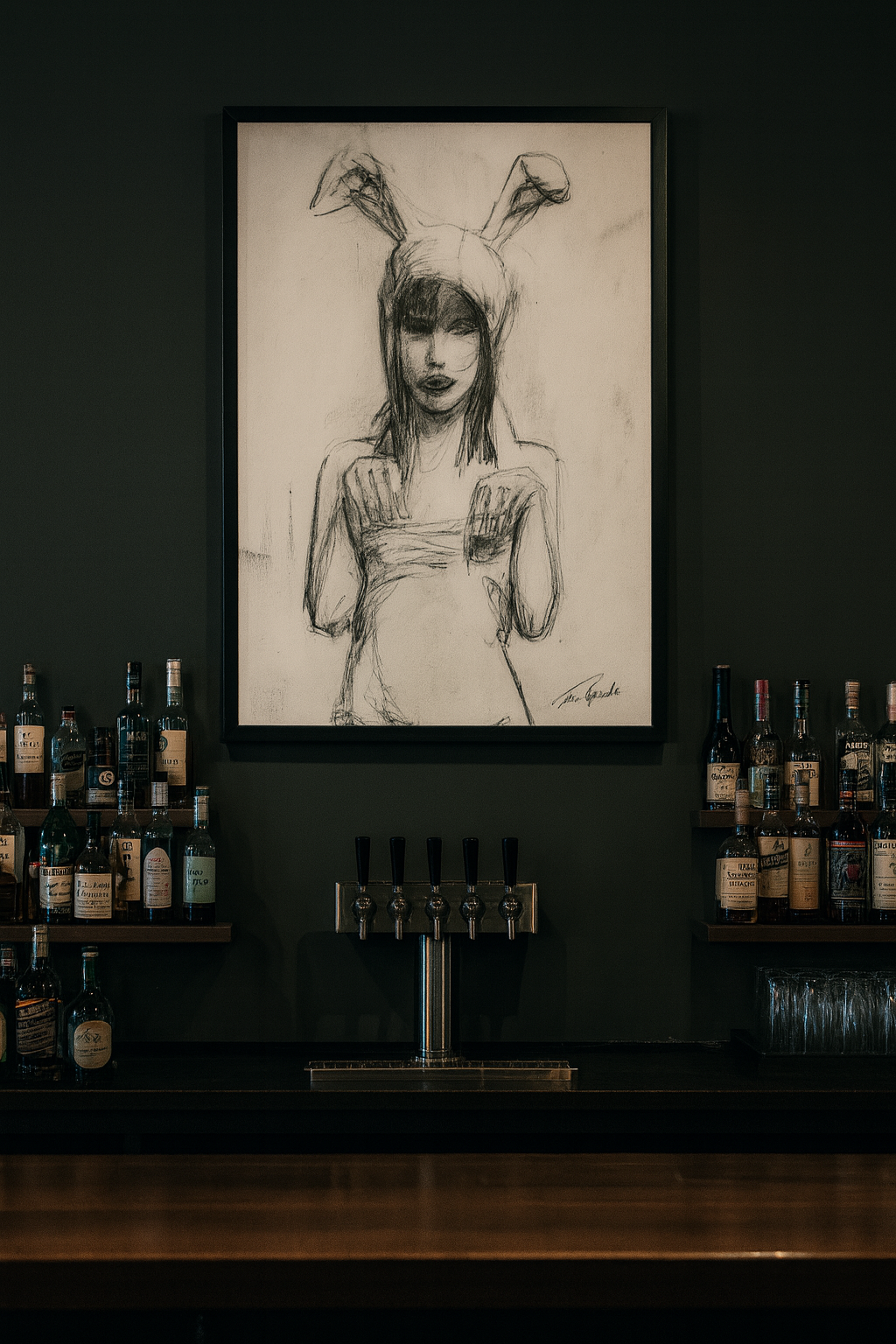 Midnight Masquerade portrays a mysterious figure with rabbit ears, sketched in bold, expressive charcoal lines. The rough textures and shadowed features suggest both playfulness and secrecy, blurring the line between costume and identity. This work invites viewers to explore themes of transformation, allure, and hidden narratives, making it a captivating focal point in any modern space.