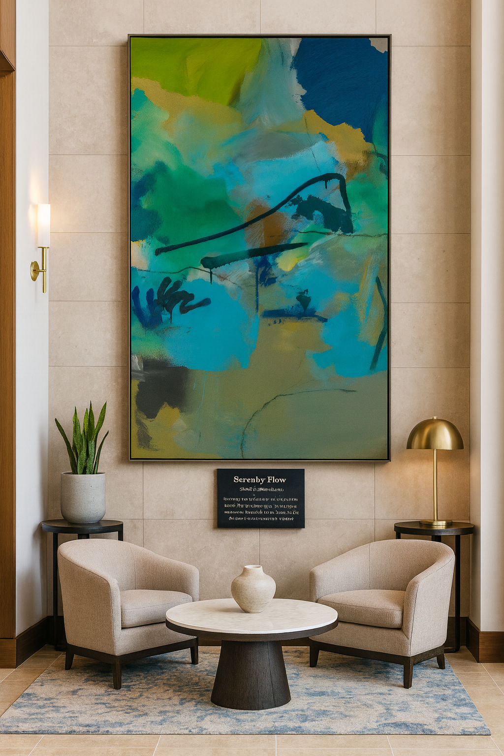 "Serenity Flow" captures the gentle movement of nature’s elements—lush greenery, flowing water, and open skies—through bold strokes of turquoise, green, and gold. The sweeping lines and layered textures invite a sense of calm and renewal, making it an ideal centerpiece for a hotel lobby. Its vibrant yet soothing palette balances energy with tranquility, offering guests an atmosphere of both sophistication and peace upon arrival.