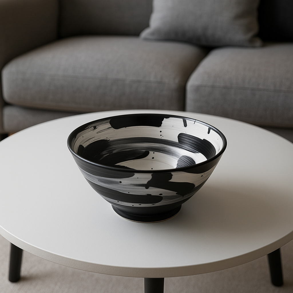 Monochrome Whispers captures the elegant balance between chaos and restraint — where each brushstroke dances across the surface in rhythm with form and emptiness. Hand-thrown and painted individually, every bowl bears the artist’s unmistakable mark of spontaneity and control.