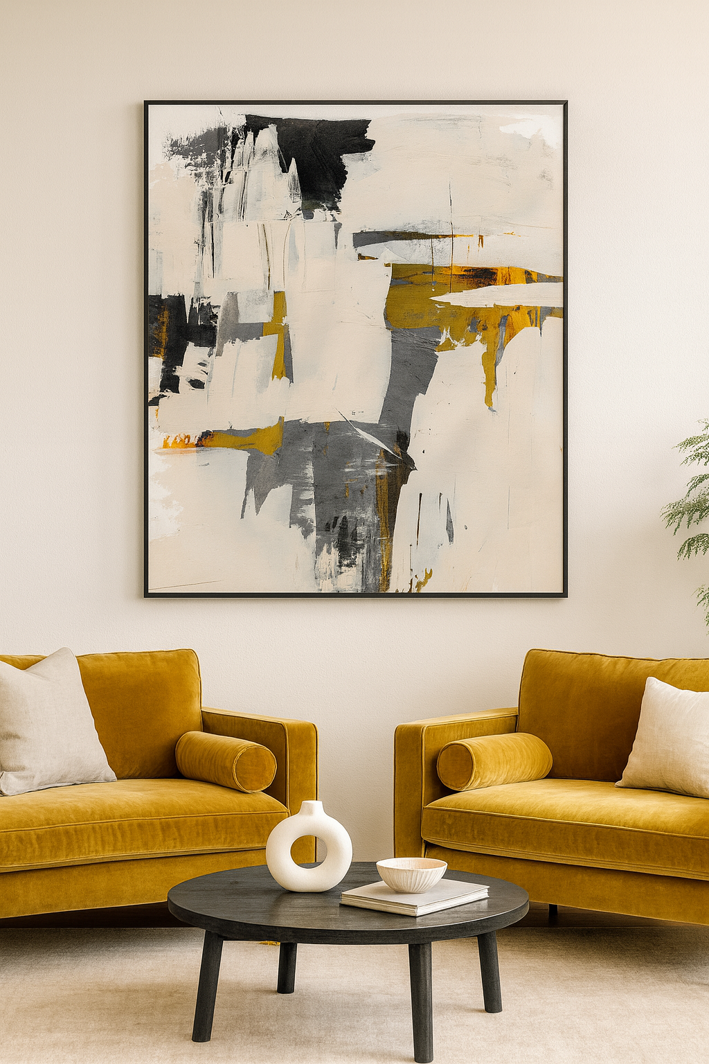 A textured abstract painting blending ivory, slate gray, and bold strokes of gold, with accents of deep black. The work evokes a landscape caught between shadow and light, creating a sense of movement and structure. Paired with two plush golden velvet loveseats, the piece brings warmth and sophistication to any modern space, balancing richness with contemporary minimalism.