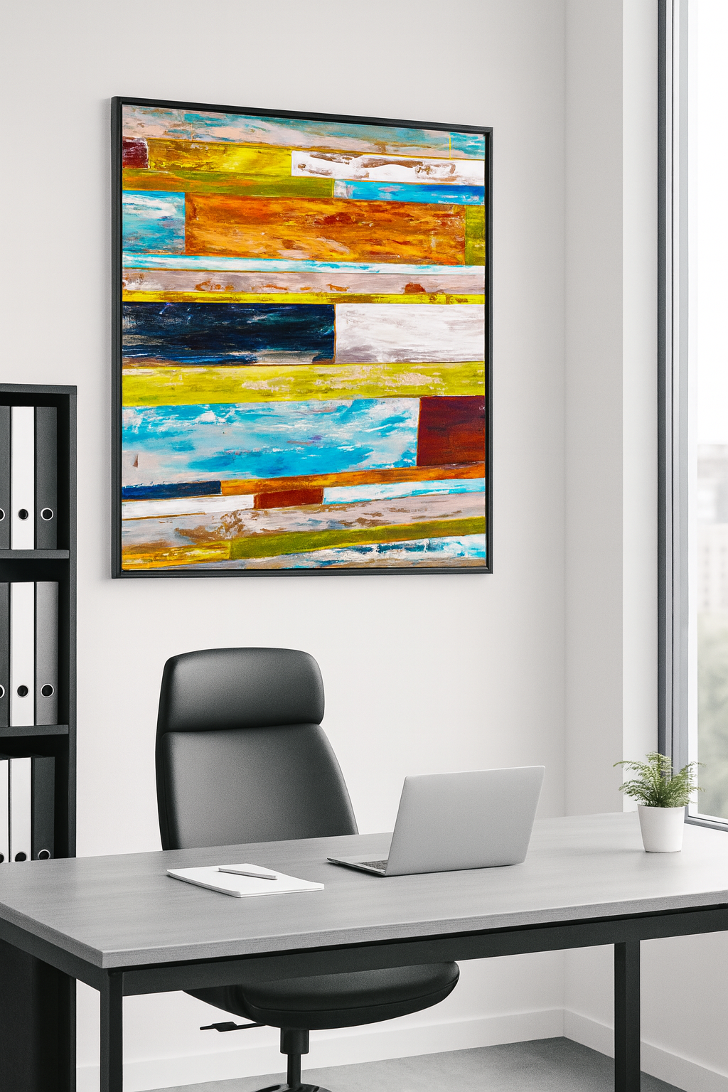 Bold blocks of color layer across the canvas like an abstract skyline, each textured stroke suggesting the rhythm and energy of an urban landscape. The mix of earthy rusts, vivid blues, and bright yellows creates a dynamic balance that feels both architectural and organic, making it a statement piece perfect for energizing modern spaces.