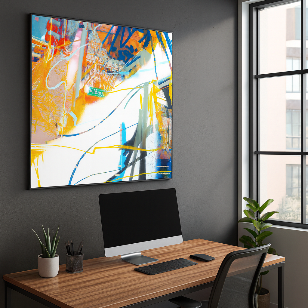 Layering vibrant streaks of orange, blue, and yellow over the recognizable street signs of Pine Street and South Magnolia, Magnolia Crossroads captures the collision of urban life and artistic abstraction. The work reflects both structure and spontaneity, grounding the viewer in a real place while surrounding it with bursts of color and motion. It’s a celebration of city energy, memory, and the ever-changing rhythm of daily life.