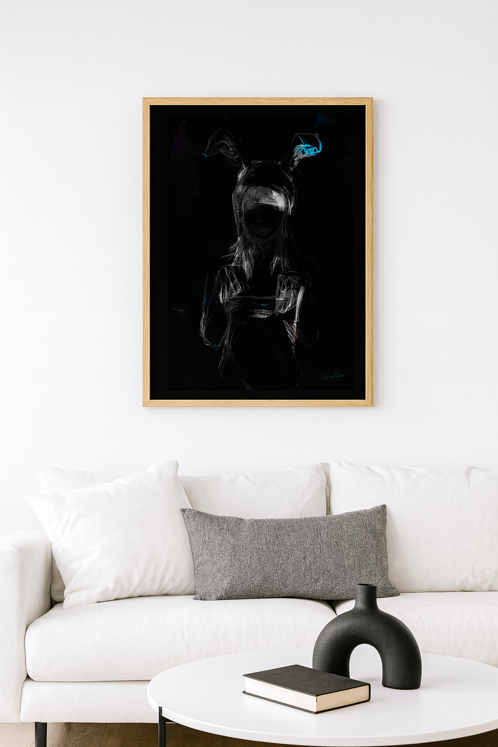 Outlined in ghostly white against a pitch-black void, Neon Silence portrays a haunting figure crowned with rabbit ears, accented by a flash of electric blue. The stark contrast between light and dark invites questions of identity, play, and mystery. Striking and enigmatic, it’s a piece that transforms minimal white spaces into bold, thought-provoking environments.