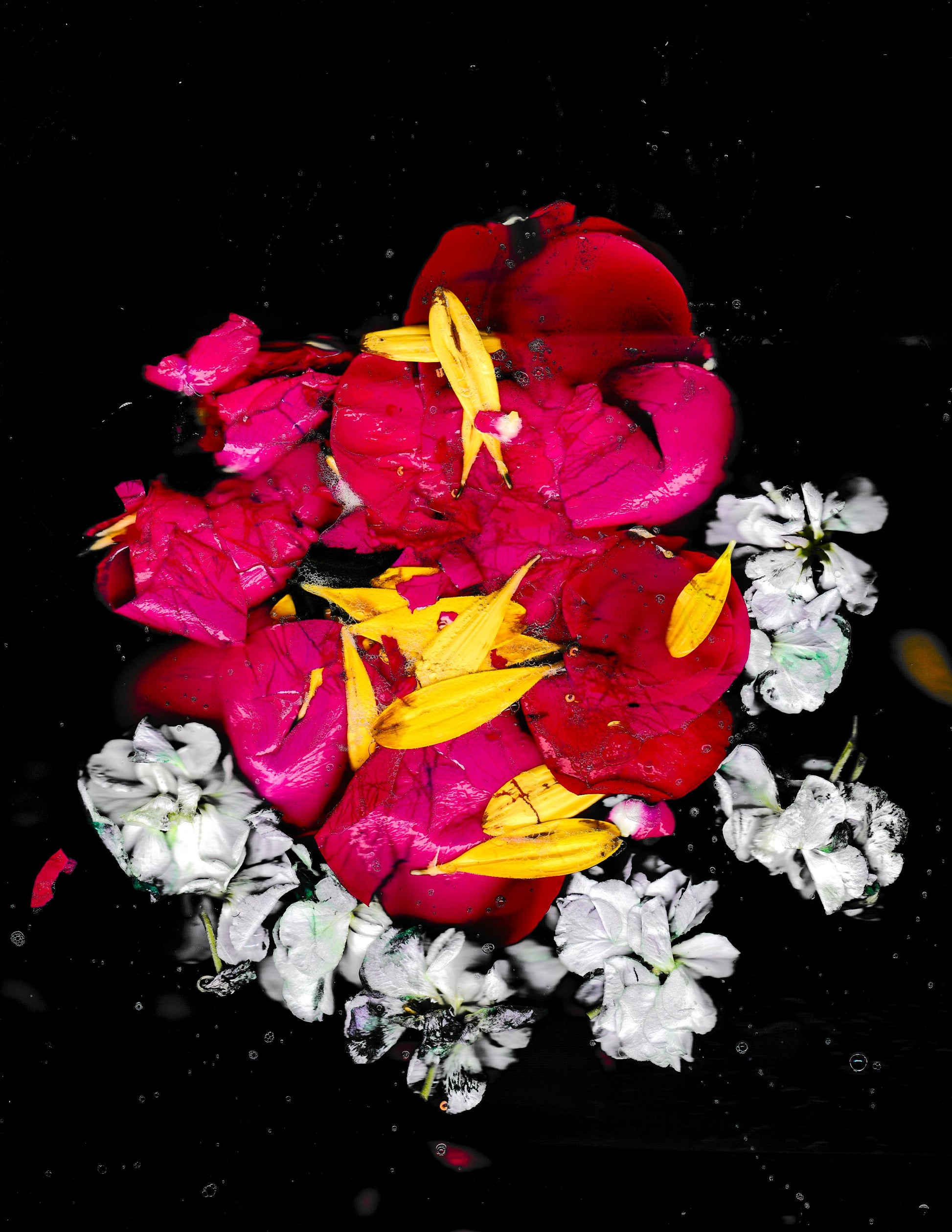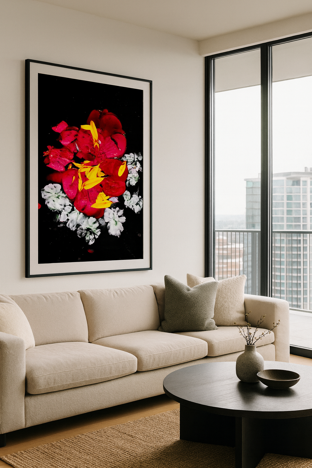 Radiant Bloomfall captures a vibrant cascade of fuchsia rose petals, golden daisy fragments, and soft white blossoms drifting together in a mesmerizing burst of color. Suspended against a deep black background, the florals glow with luminous intensity—each petal appearing to float, collide, and dissolve in a delicate choreography. Tiny bubbles and subtle distortions lend the piece a fluid, underwater-like dimension, transforming the bouquet into an abstract, radiant constellation.