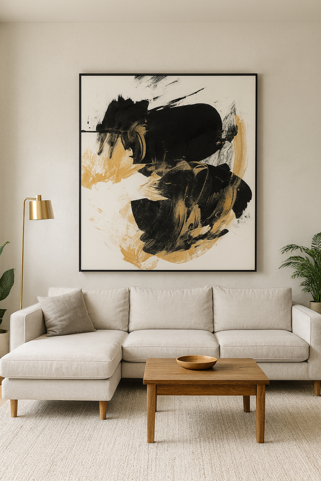 Sweeping charcoal gestures collide with warm citrine swaths, forming a dynamic circular flow that feels both bold and balanced. The high-contrast palette and generous negative space create a modern statement piece—perfect for neutral living rooms, especially alongside wood tones and brass accents.
