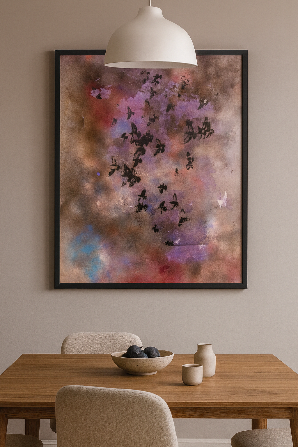Dark silhouettes of birds scatter across a dreamy backdrop of purples, pinks, and muted blues, evoking both serenity and mystery. Flight Through Dusk captures the fleeting beauty of migration and the endless motion of life, suspended in a haze of shifting color. The piece suggests freedom and transition, making it a contemplative centerpiece for intimate dining or reflective spaces.