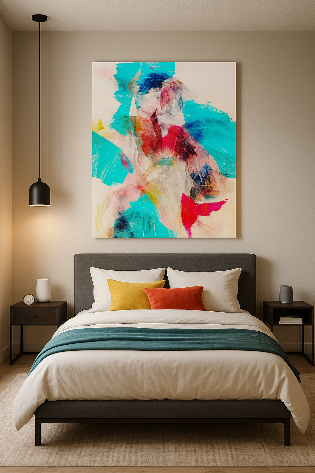 A vivid exploration of color and energy, Whispers of Radiance bursts with electric turquoise, bold crimson, and soft golden hues layered against airy whites. The composition feels both fluid and dynamic, suggesting movement, emotion, and the ephemeral dance of light. This piece invites viewers to lose themselves in its shifting textures and vibrant contrasts, evoking a sense of freedom, passion, and renewal. Perfect for spaces seeking a statement of vitality and artistic depth.