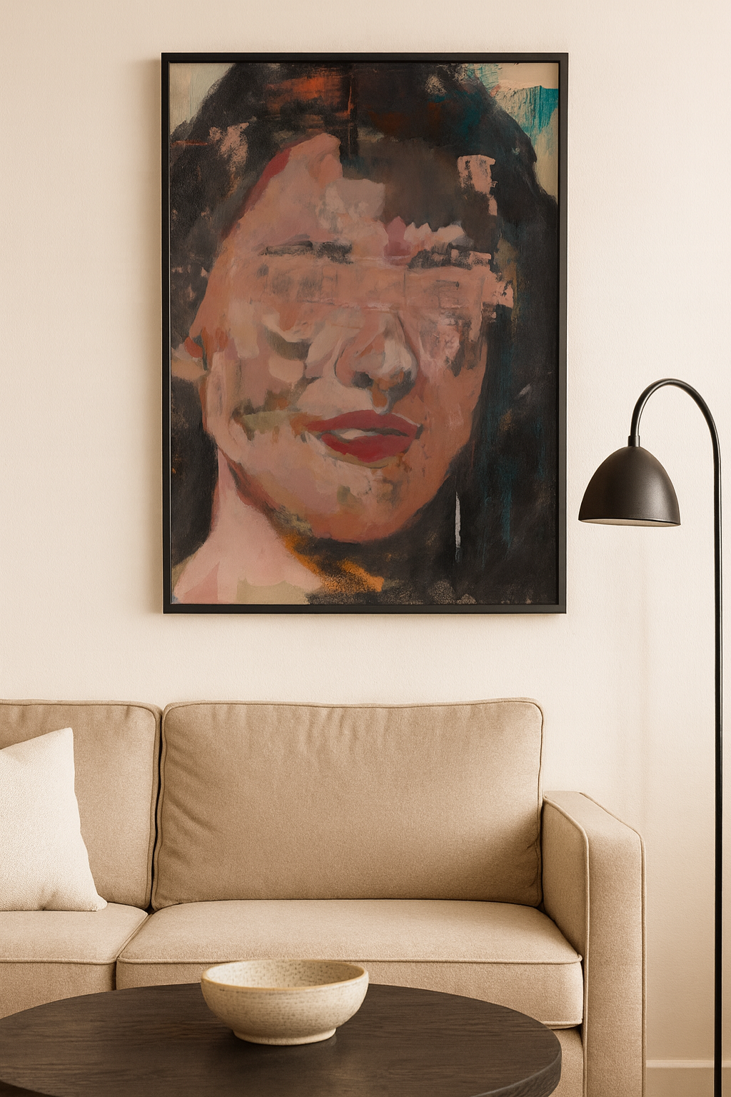 Veiled Memory explores the blurred line between identity and perception. Through fragmented brushstrokes of rose, sienna, and shadowed teal, the portrait conveys both intimacy and distance—an emotional abstraction of the human face. The softened features and layered texture evoke memory, secrecy, and self-reflection, making it a thought-provoking centerpiece for sophisticated, minimalist interiors.