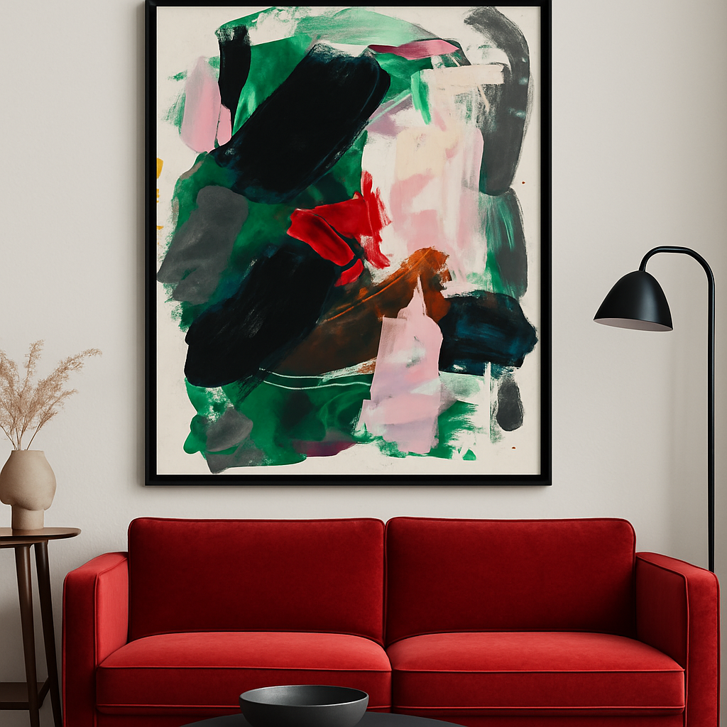 Crimson Momentum is an explosion of energy and contrast — bold black and emerald strokes clash and blend with fiery red and soft blush undertones, creating a visceral rhythm across the canvas. The piece evokes motion, tension, and release, making it a commanding focal point for modern spaces that embrace expressive emotion and contemporary edge.