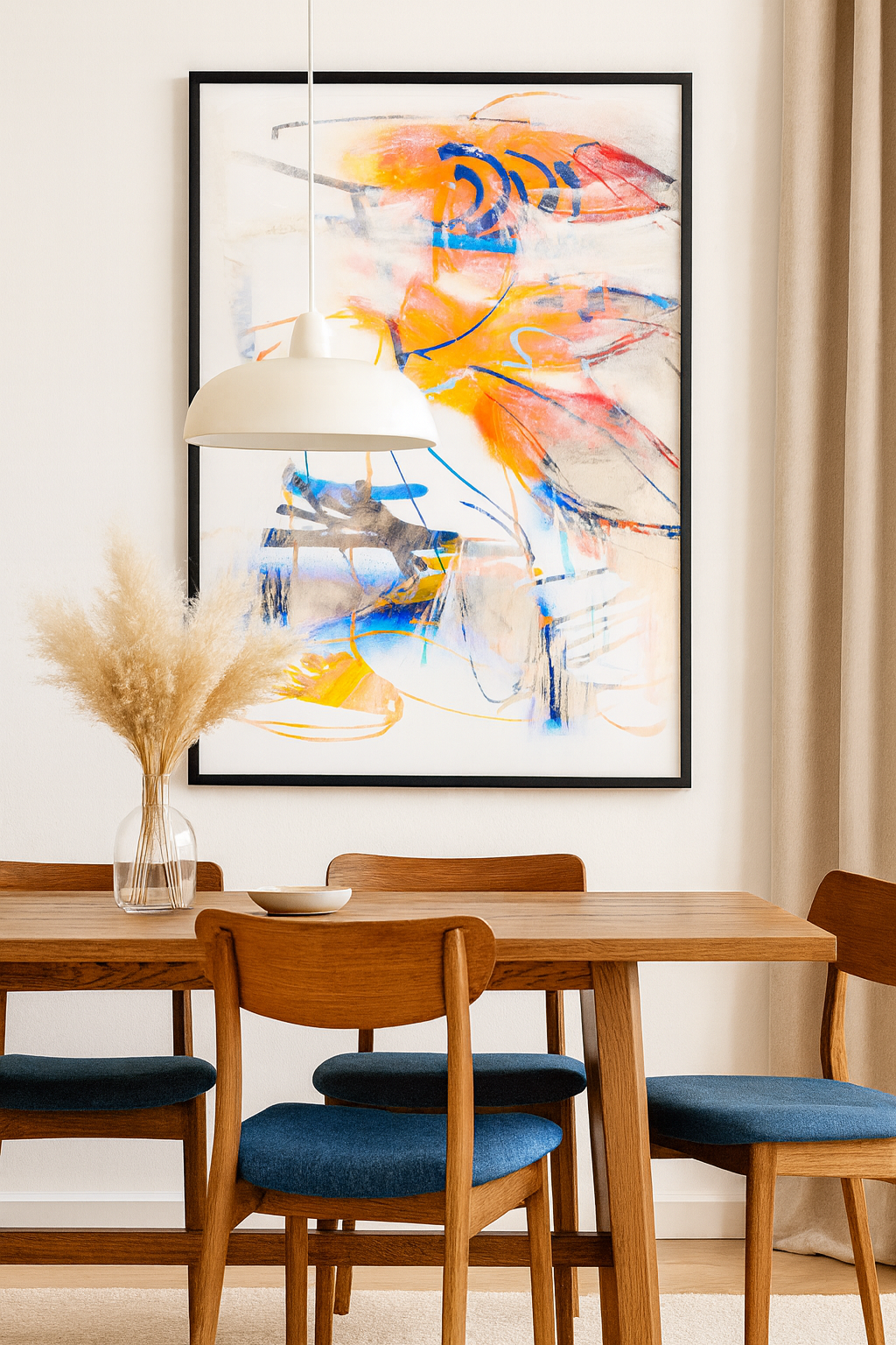 Solar Drift captures the essence of movement and illumination — a radiant interplay of golden orange, cobalt blue, and soft gray strokes that flow with spontaneous energy. The airy white background enhances its sense of motion and light, creating a composition that feels alive and expansive. Perfect for dining spaces that balance warmth, creativity, and modern sophistication.