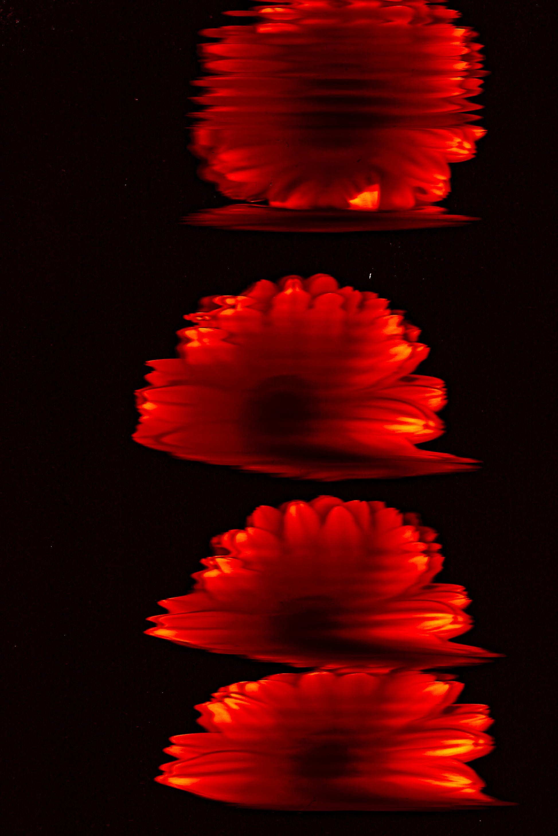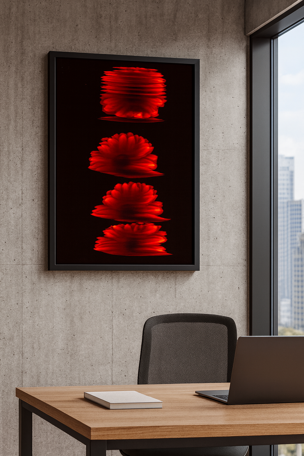 Crimson Ascension captures the rhythmic rise of glowing, flower-like forms as they emerge from darkness and climb upward in a sequence of molten red light. Each layer appears to shift and unfurl, creating a sense of movement, evolution, and upward momentum. The vertical composition gives the piece a meditative balance—both fierce and serene—making it a striking focal point for any modern space.