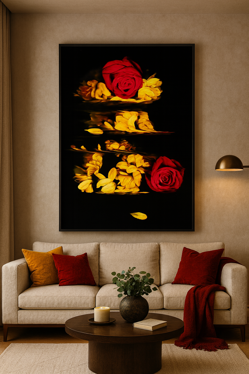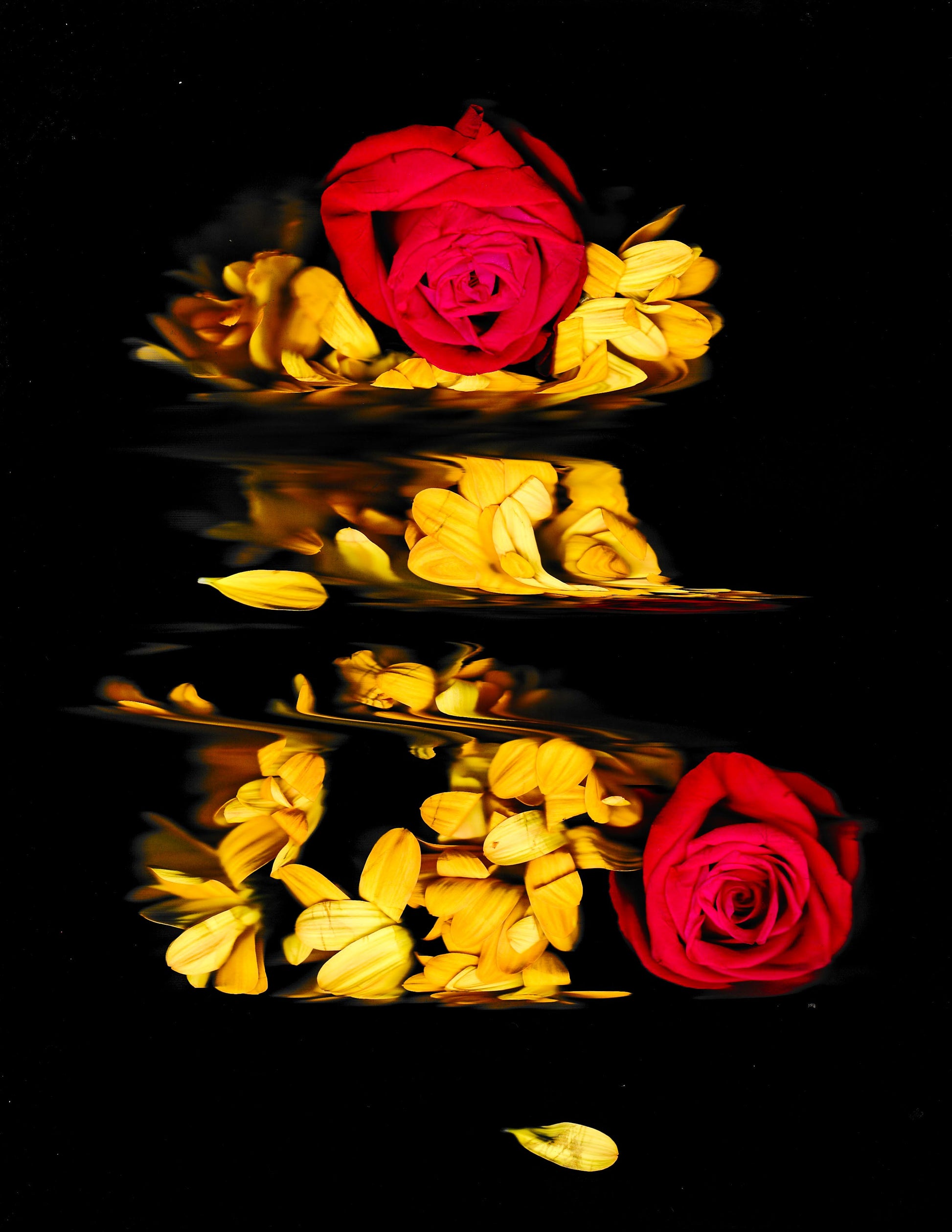 Crimson Drift captures the delicate dance of two red roses surrounded by cascades of golden petals, all suspended in a dreamlike ripple of motion. Against the deep black backdrop, every color becomes more vivid—the red blooms glow with intensity, while the sunflower petals shimmer like scattered embers. The layered reflections create a sense of depth and movement, as if the flowers are drifting across a quiet body of water.