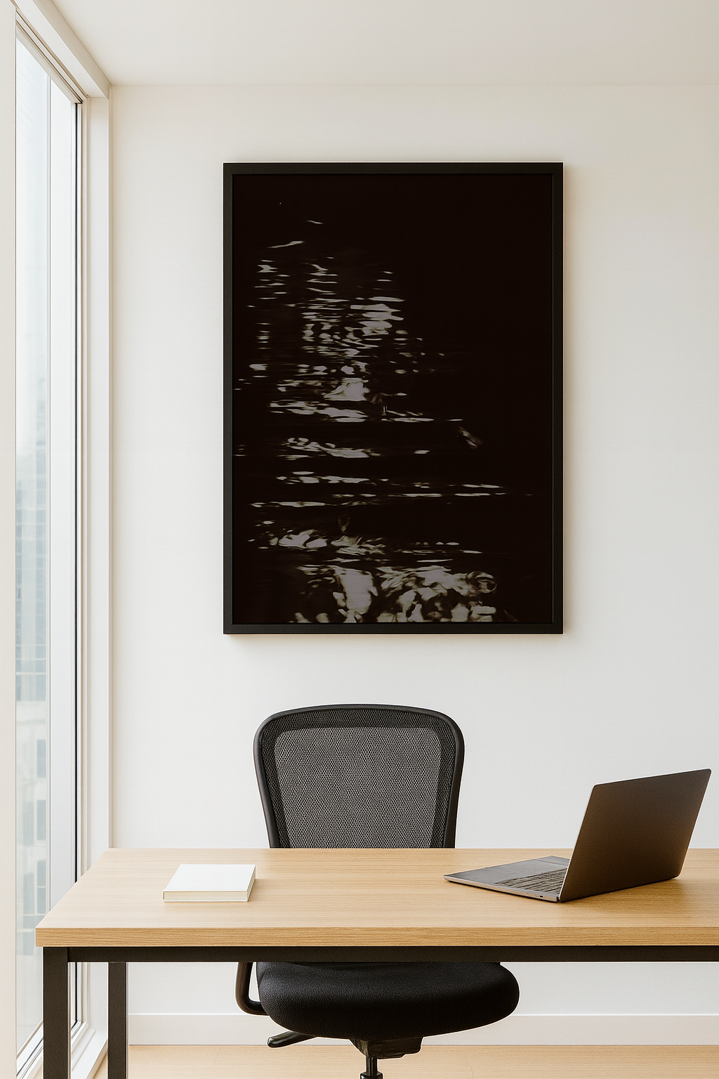 Echoes Beneath captures the subtle movement of pale petals drifting across dark, reflective water. Soft highlights shimmer through the composition, creating an abstract rhythm that feels both fluid and mysterious. The image appears almost like a memory surfacing—a quiet pulse beneath the surface, blurred by time and motion. With its deep contrasts and gentle luminosity, Echoes Beneath brings a calming yet enigmatic presence to any modern space.