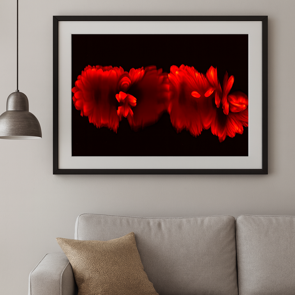 Ember Bloom is an abstract study of energy coming to life. Vivid red forms rise and unfurl like petals ignited from within, glowing against a deep black backdrop. Soft, fluid shapes appear to bloom in waves, creating a sense of motion, warmth, and quiet intensity.