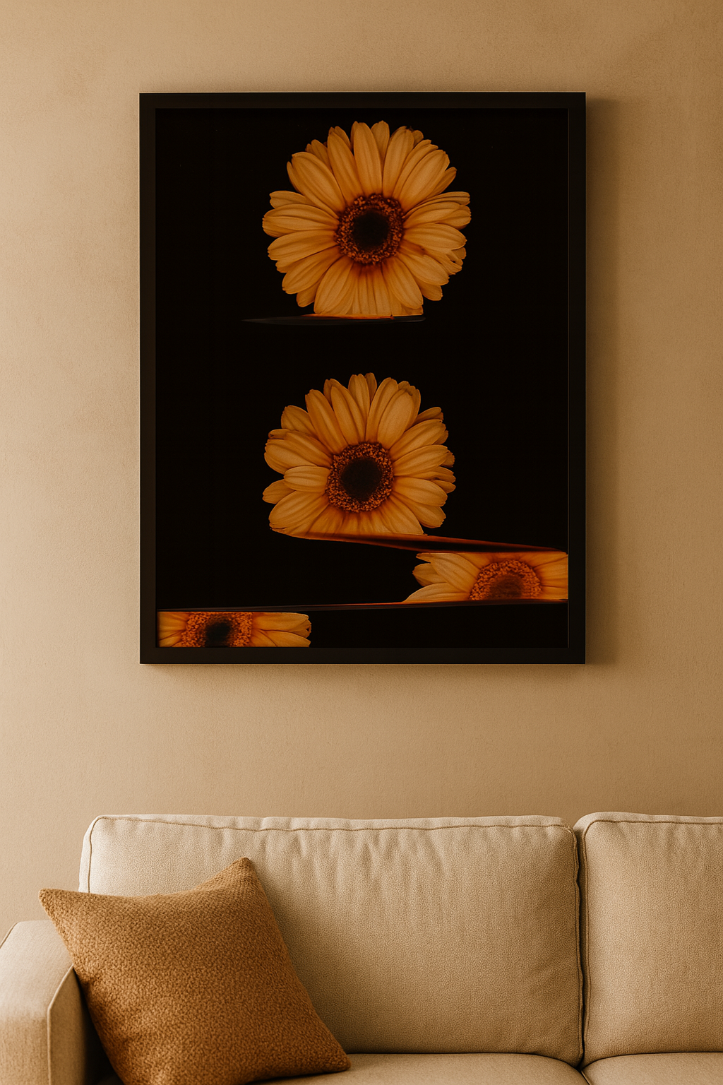 Golden Echo captures the repetition of a single daisy as it appears to drift across a dark field, leaving warm traces of movement behind. The petals glow in soft golden tones, creating a striking contrast against the deep black background. The subtle distortion at the edges gives the piece a dreamlike, almost cinematic quality—like moments caught between stillness and motion. Both calming and visually bold, Golden Echo brings a sense of warmth and quiet rhythm to any space.