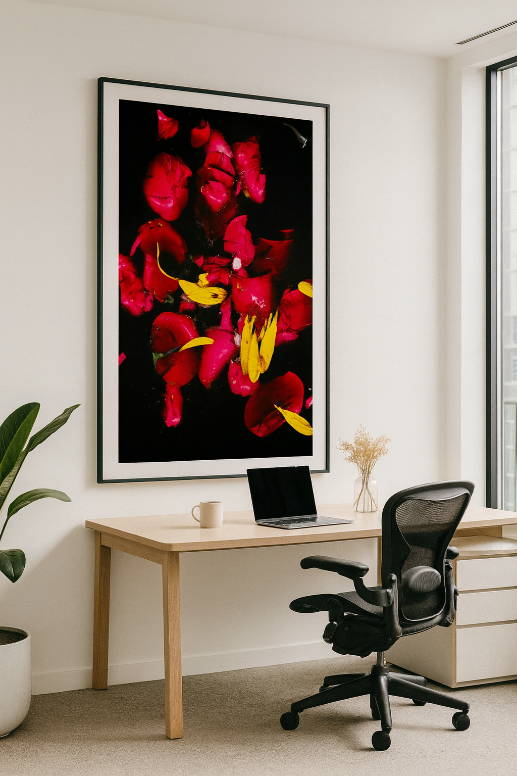 Petals in Motion captures a vivid burst of fuchsia rose petals scattered across a deep black field, accented by streaks of golden yellow. The composition feels alive—each petal suspended in a moment of drift, collision, or quiet descent. Tiny bubbles and soft distortions create a sense of movement, almost as if the petals are floating through water or dissolving into light.