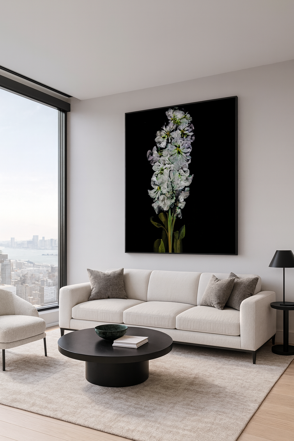 Pillar of Bloom presents a tall, elegant column of white petals rising out of darkness. Subtle hints of green and lavender weave through the layers of soft, delicate flowers, giving the piece a quiet yet powerful presence. The deep black backdrop amplifies every contour and texture, allowing the bloom to feel both sculptural and ethereal. With its serene palette and graceful vertical form, Pillar of Bloom brings a sense of calm, refinement, and understated luxury to any space.
