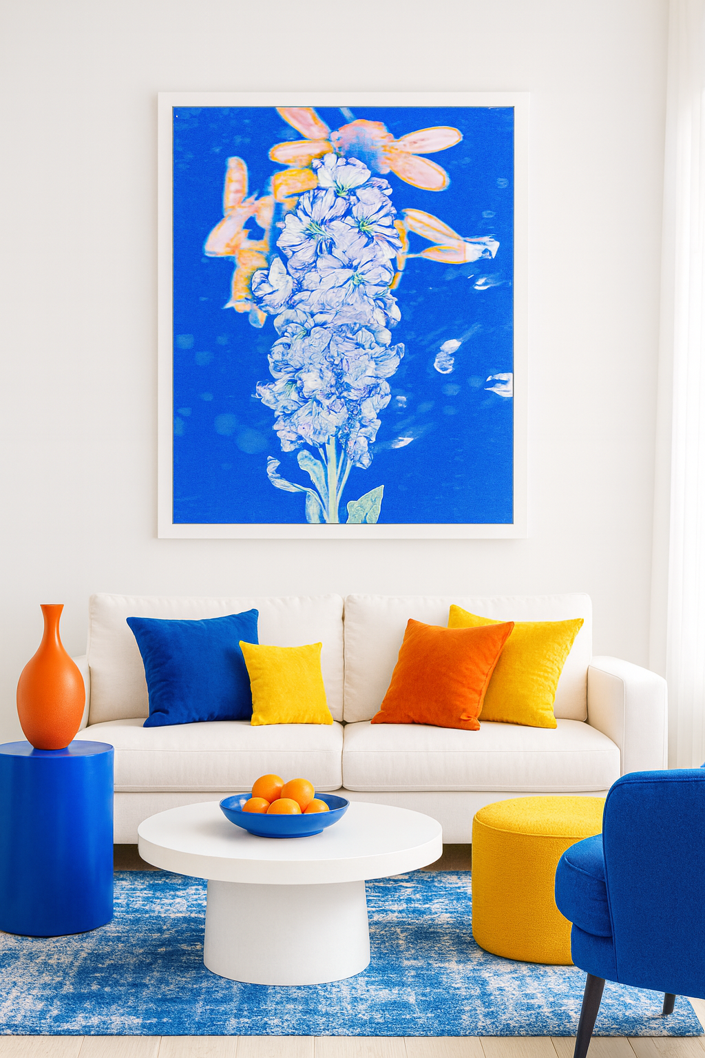 Solar Bloom bursts with luminous energy, merging cool electric blues with radiant sun-washed oranges. The layered florals appear to glow from within, as if lit by an otherworldly light source. Petals overlap and shimmer in a dreamy, painterly haze, creating a sense of motion and ethereal depth. The bold color contrast gives the piece a dynamic, uplifting presence—both calming and electrifying—making it a striking centerpiece for any modern space.